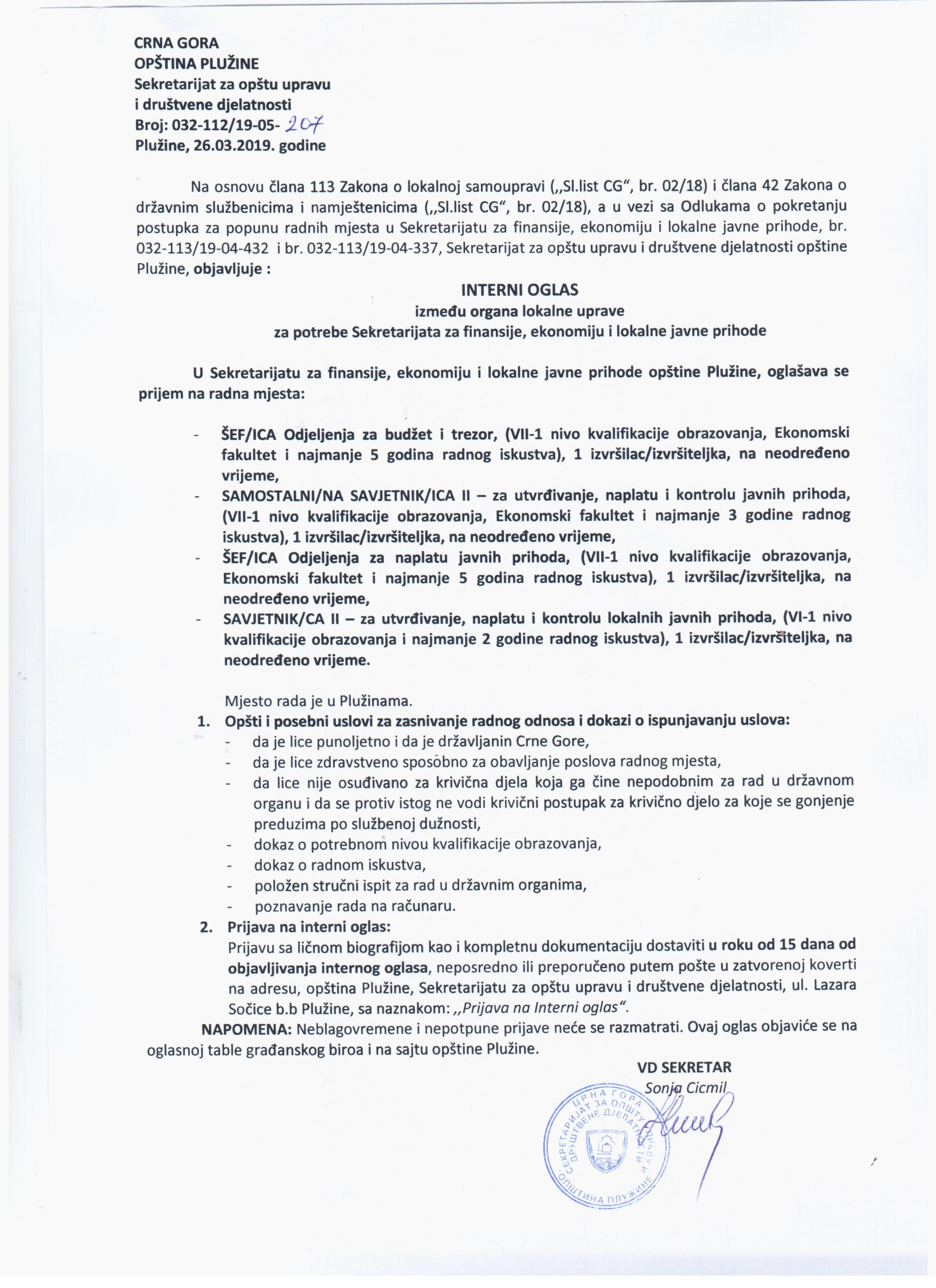 На основу члана 113 Закона о локалној самоуправи (,,Сл.лист ЦГ“, бр. 02/18) и члана 42 Закона о државним службеницима и намјештеницима (,,Сл.лист ЦГ“, бр. 02/18), а у вези са Одлукама о покретању поступка за попуну радних мјеста у Секретаријату за финансије, економију и локалне јавне приходе, бр. 032-113/19-04-432 и бр. 032-113/19-04-337, Секретаријат за општу управу и друштвене дјелатности општине Плужине, објављује :
